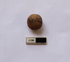 | Description / विवरण | A terracotta sling ball which is spherical in shape. It is dull red in color and damaged in condition. |