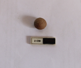 | Description / विवरण | A terracotta sling ball which is spherical in shape. It is dull red in color and damaged in condition. |