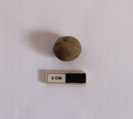 | Description / विवरण | A terracotta sling ball which is spherical in shape. It is grey in color and damaged in condition. |
