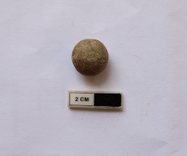 | Description / विवरण | A terracotta sling ball which is spherical in shape. It is dull red in color and damaged in condition. |