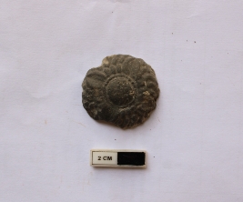 | Description / विवरण | A terracotta pendant which is circular in shape and has decorative flower pattern on its surface. it is partly broken and grey in color. |