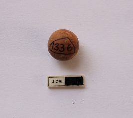 | Description / विवरण | A terracotta sling ball which is spherical in shape. It is dull red in color and damaged in condition. |