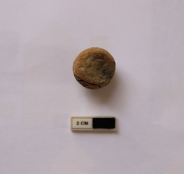 | Description / विवरण | A terracotta sling ball in a spherical shape. It is dull red in color and partially damaged. |