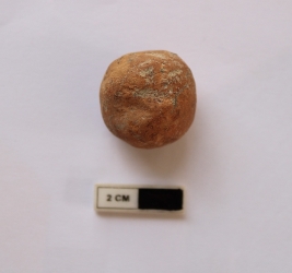 | Description / विवरण | A terracotta sling ball in a spherical shape. It is dull red in color and partially damaged. |