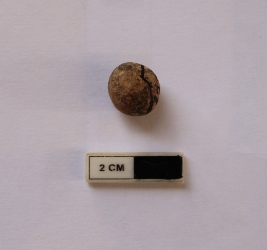 | Description / विवरण | A terracotta sling ball in a spherical shape. It is dull red in color and partially damaged. |