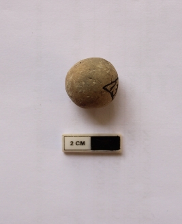 | Description / विवरण | A terracotta sling ball in a spherical shape. It is dull red in color and partially damaged. |