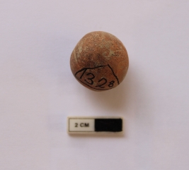 | Description / विवरण | A terracotta sling ball in a spherical shape. It is dull red in color and partially damaged. |