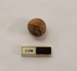 | Description / विवरण | A terracotta sling ball which is spherical in shape. It is dull red in color and damaged in condition. |
