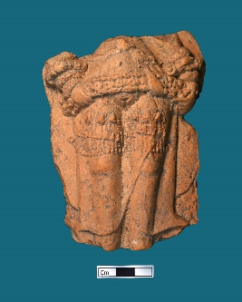 | Description / विवरण | The broken terracotta plaque depicts a human figurine that remains intact between the belly and ankle. The object is adorned with a highly ornamented waist brace and a graciously ornamented thick bangle. Drapery can be seen, and the thighs are decorated with ornaments as well. Both hands are rested on the waist. |