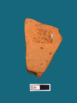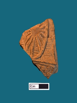 | Description / विवरण | A fragment of a terracotta plaque reveals a portion of a wheel, complete with spokes and adorned with delicate decorations, all set against a vibrant red backdrop. |