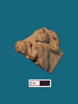 | Description / विवरण | A broken terracotta plaque depicts two figurines. One is positioned in the background, its head turned to the left revealing a distinct hair knot atop, hands gracefully presented, and wearing drapery. The other figure partially obscured, only revealing a portion of the face with hair neatly parted. |
