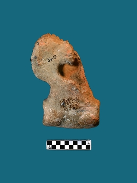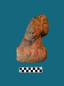 | Description / विवरण | The fragment of a terracotta toy cart reveals the partial depiction of a head of a ram, its right portion marred by breakage. Intricate details emerge elsewhere on its body, with small raised dots interspersed with floral motifs adorning the surface. Notably, noticeable perforations punctuate the piece, hinting at its function and design. |