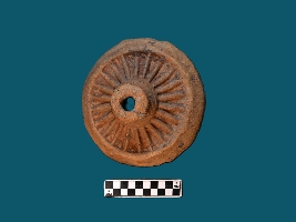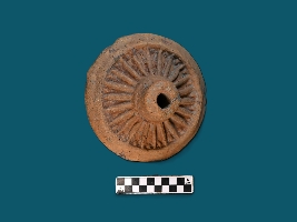 | Description / विवरण | A well decorated terracotta wheel of a toy cart which is red in colour with smooth surface. The central of the wheel is thick and has a perforation is there. The surface of the object is decorated with spoked design. |
