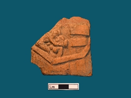 | Description / विवरण | The terracotta plaque captures an intimate moment between a couple, depicted in a face-to-face position. The man gently grasps the neck of the woman, conveying a sense of closeness and affection. Adornments grace the woman s figure, including an armlet, necklace, and a circular earring adorning her left ear. Her hair is elegantly tied in a knot. Meanwhile, the man is depicted wearing a cap-like headpiece. Both figures are situated within a fragmented border. |