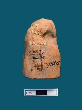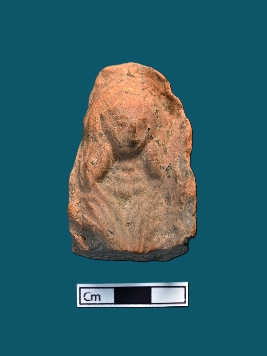 | Description / विवरण | A terracotta plaque depicting a female figurine adorned with large circular ear rings. Face is partly visible. There are some decorations depicted on its body. |