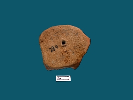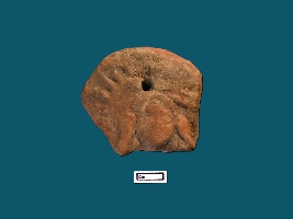 | Description / विवरण | A terracotta plaque showing a face of a human figurine. The face is not clearly visible. A perforation can be seen on top probably used for hanging purpose. |