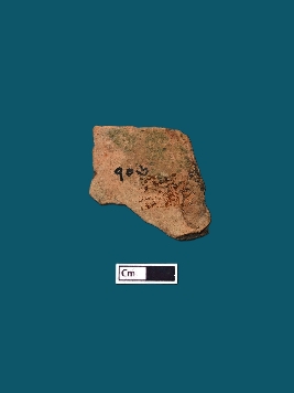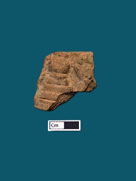 | Description / विवरण | The fragmented terracotta plaque displays several decorations arranged in a pattern rectangular boxes positioned in decreasing sizes, culminating in a circular object at the apex. The rest of the plaque remains obscured from view. |