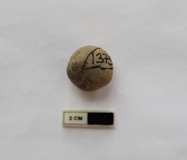 | Description / विवरण | A terracotta sling ball which is spherical in shape. It is greyish red in color and damaged in condition. |