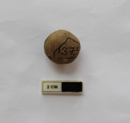 | Description / विवरण | A terracotta sling ball which is spherical in shape. It is grey in color and damaged in condition. |
