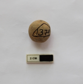 | Description / विवरण | A terracotta sling ball which is spherical in shape. It is dull grey in color and damaged in condition. |