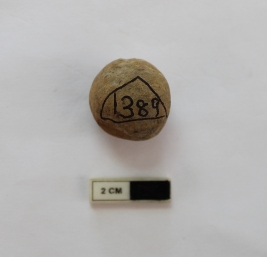 | Description / विवरण | A terracotta sling ball in a spherical shape. It is dull red in color and damaged in condition. |