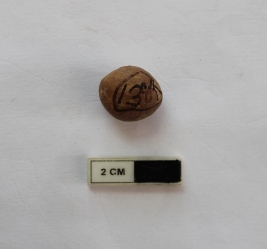 | Description / विवरण | A terracotta sling ball in a spherical shape. It is dull red in color and damaged condition. |