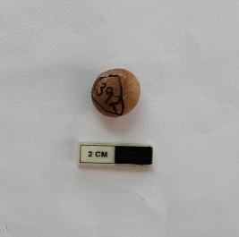 | Description / विवरण | A terracotta sling ball in a spherical shape. It is dull red in color and damaged in condition. |