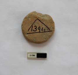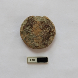 | Description / विवरण | A terracotta hopscotch in a circular shape. It is dull red in color and broken in condition. |