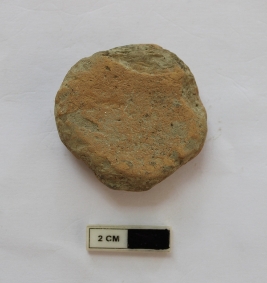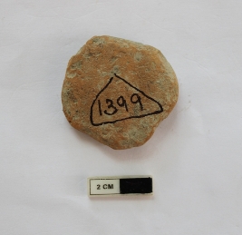 | Description / विवरण | A terracotta hopscotch in a circular shape. It is muted red in color and damaged in condition. |
