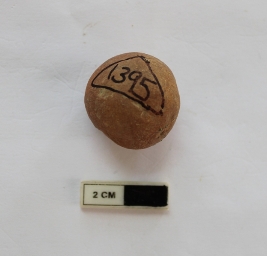 | Description / विवरण | A terracotta sling ball which is spherical in shape. It is dull red in color and damaged in condition. |