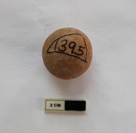 | Description / विवरण | A terracotta sling ball which is spherical in shape. It is red in color and damaged in condition. |