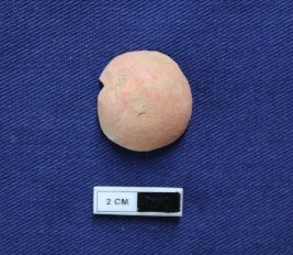 | Description / विवरण | A terracotta sling ball which is spherical in shape. It is bright red in color and damaged in condition. |