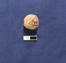 | Description / विवरण | A terracotta sling ball which is spherical in shape. It is bright red in color and damaged in condition. |