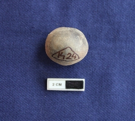| Description / विवरण | A terracotta sling ball which is spherical in shape. It is dull red and black in color and damaged in condition. |