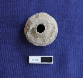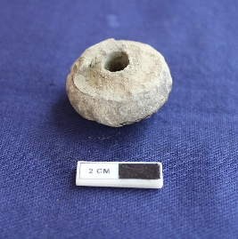 | Description / विवरण | A terracotta bead in arecanut shape. It is gray in color and damaged in condition. |
