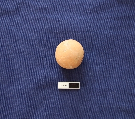 | Description / विवरण | A terracotta sling ball in a spherical shape. It is dull red in colour. |