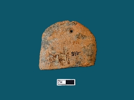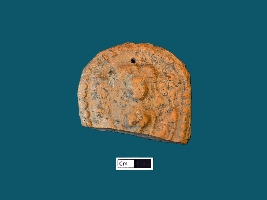 | Description / विवरण | A fragmented plaque depicts a female figurine, with visible breasts and partly visible hands. A perforation is present for hanging. The plaque borders are adorned with beaded decorations. It is broken below the breasts. |