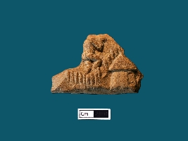 | Description / विवरण | The fragmented Terracotta plaque, adorned with intricate scenes, depicts a captivating narrative. In the foreground, a male figure is depicted climbing upwards, holding a huge object on his shoulder. A hut is depicted in the left bottom corner. |