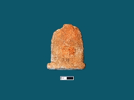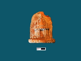 | Description / विवरण | A terracotta plaque displays intricate miniature temple architecture, adorned with six ratnas arranged in a triangular formation. Pillars are depicted throughout the structure. In the center, a circular depiction likely represents a deity. The entire plaque is embellished with a beaded design along its borders. |