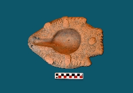 | Description / विवरण | Terracotta lamp with small handle. Wick is intact and slips treatment given in red colour. It has straight flatted and thick rim. The upper portion of the lamp is decorated with beaded design. The surface of the object is smooth. |