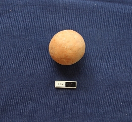 | Description / विवरण | A terracotta sling ball in a spherical shape. It is dull red in colour. |
