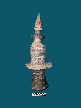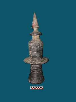 | Description / विवरण | This terracotta finial boasts an elegant composition divided into three distinct sections. At its zenith rests a gracefully conical apex, lending a regal air to its countenance. Below, a meticulously crafted cylindrical segment, embellished with a series of subtle grooves, is perched upon an extended circular base. The lowermost component, also cylindrical in form, culminates in a flattened base, providing stability and grounding to the overall structure. The object is black in colour with polished surface. |