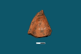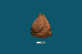 | Description / विवरण | A fragmentary terracotta plaque depicting a leaf adorned with decorative elements outside its perimeter. The rest of the plaque is obscured from view. |