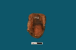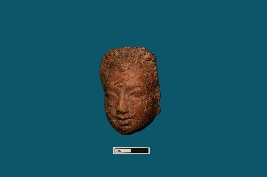 | Description / विवरण | A terracotta human face adorned with stylistic back brush hair commands attention. Its face is fully visible, with a decorative dot adorning the forehead. The eyes appear opened, while the nose and lips are prominently defined. |