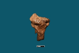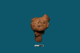 | Description / विवरण | A terracotta human head with rounded eyes, broad lips, and a visible nose captures attention. Its face is gently tilted upwards. Decoration can be seen both side of the head. A long, thick portion is attached below the head, likely a part of this figurine. |