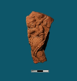 | Description / विवरण | The terracotta plaque portrays a fragmented couple, with only the head and left hand of the male figure visible as he holds the female figure from behind. The male wears a turban with a beaded design and a bracelet, while the female dons a decorated frock with a girdle at the knee portion. Few parts of the female figurine are visible. Another human figurine s face is depicted on the left top. |