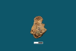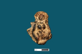 | Description / विवरण | A terracotta plaque depicts an eroded female figurine with a visible face and a circular earring in the left ear. Both hands are placed on the waist, adorned with a series of bangles. A thick waistbrace with beaded decoration is visible, along with the breast. The head of the figurine is tilted towards the left. |