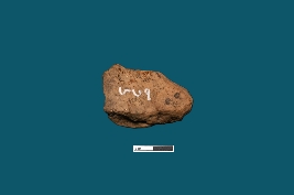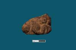 | Description / विवरण | A terracotta plaque displays a human figurine placed in a one-sided form, with only the left hand and an eroded face visible. |