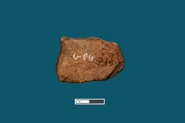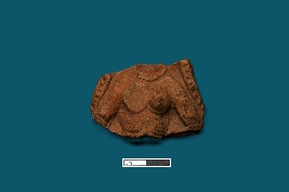 | Description / विवरण | A broken female figurine is depicted on a terracotta plaque, intact from the neck to the upper belly, with the left breast intact while the right one is broken. Both hands are visible up to above the elbow, with the rest missing. |