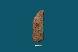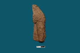 | Description / विवरण | A fragmented plaque reveals a partial human figurine, with only a portion of the left leg remaining. The waist is adorned with a waist belt decorated with three lines and a beaded design, with additional depictions on the thigh. |